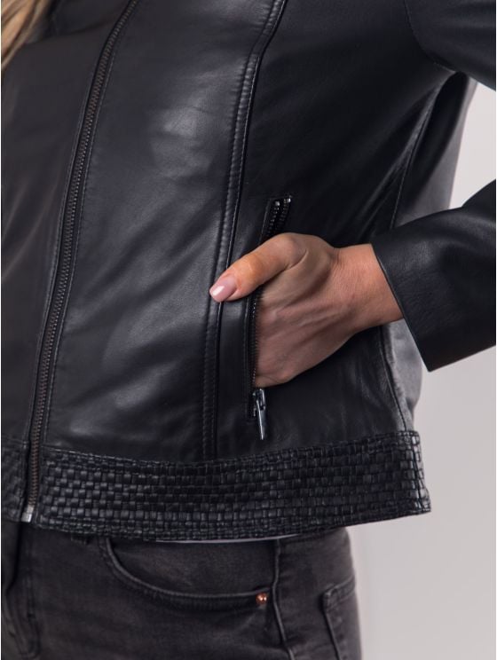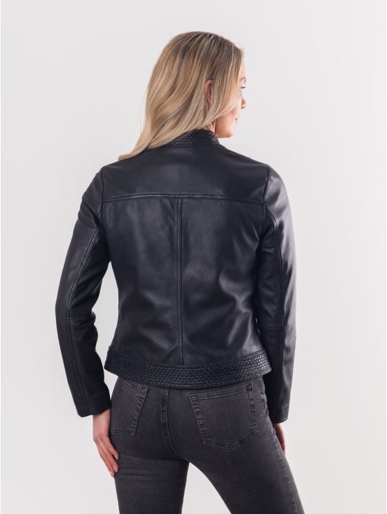 Add understated sophistication to your look with the Anthorn leather jacket, now in timeless black. Crafted from soft nappa leather, the Anthorn features a centre zip fastening and front zip pockets for an easy and flattering wear. We love the unique woven detailing on the neck and waistline, which adds texture and interest to this subtly styled jacket.