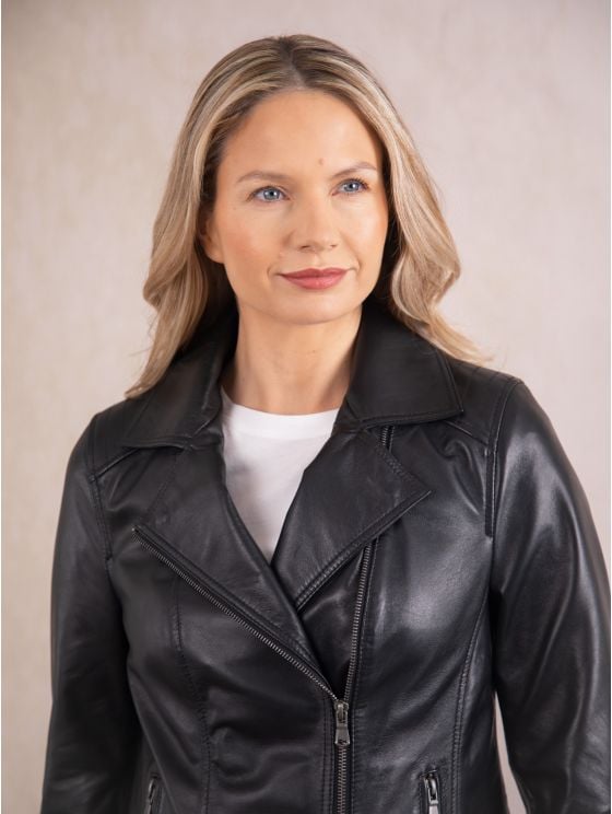 A refined take on an iconic silhouette, the Antonia biker jacket is a true wardrobe staple. Crafted from supple nappa leather, it features an asymmetric zip fastening, stitch detailing on the shoulders and sleeves, and adjustable buckle side tabs for a tailored fit. Sleek yet effortless, with a smooth satin fabric lining for a luxurious feel, this is a forever piece that blends timeless style with modern sophistication.