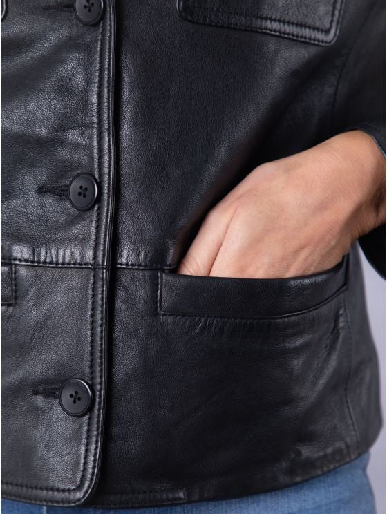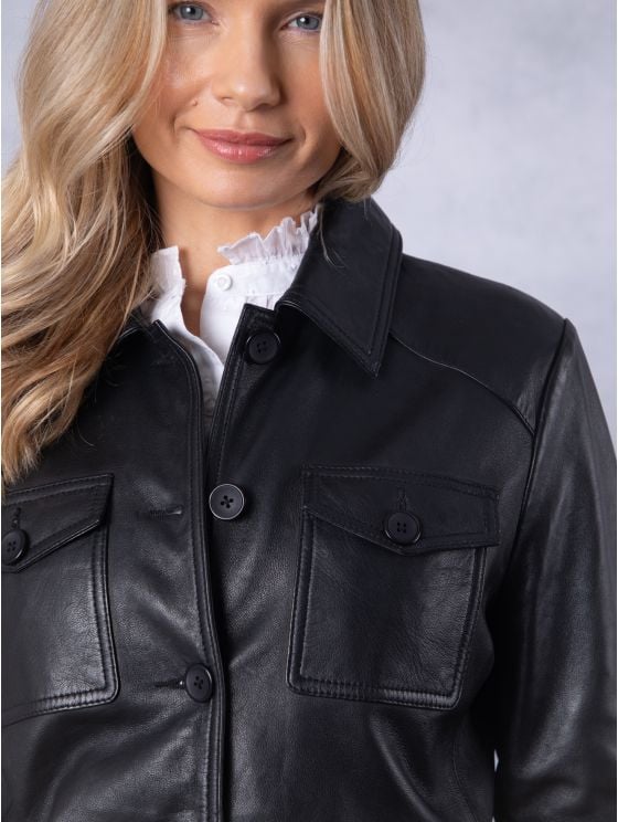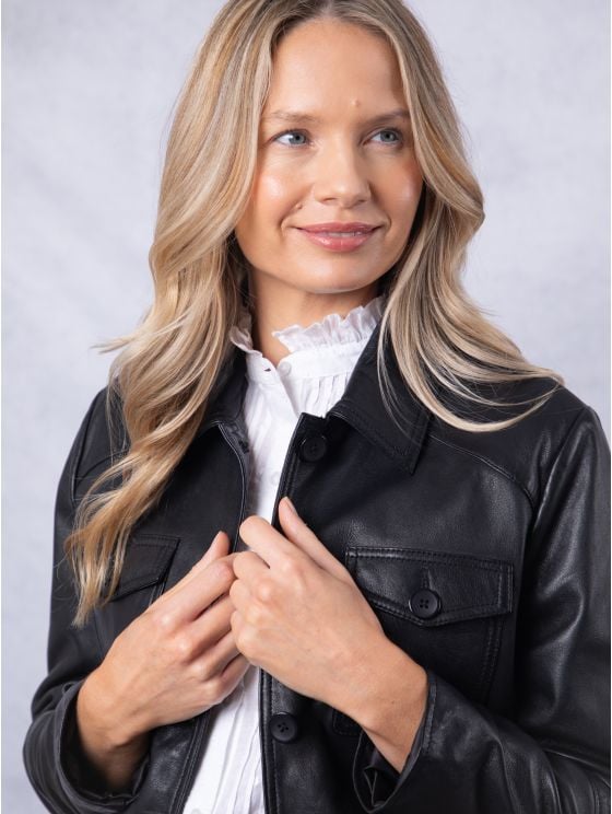 Leather jackets are usually made from cowhide, sheepskin, goatskin, or lambskin. Faux leather jackets use PU or vegan leather.