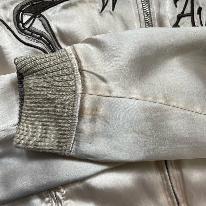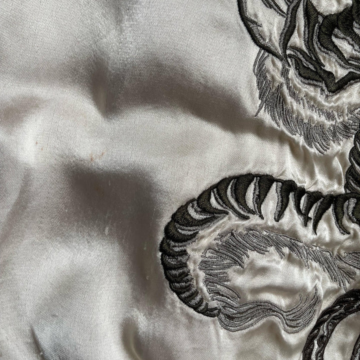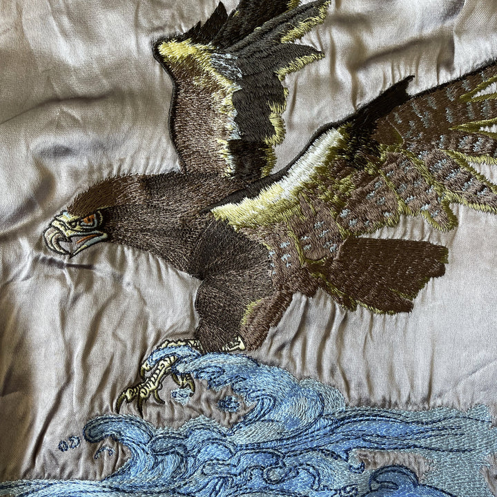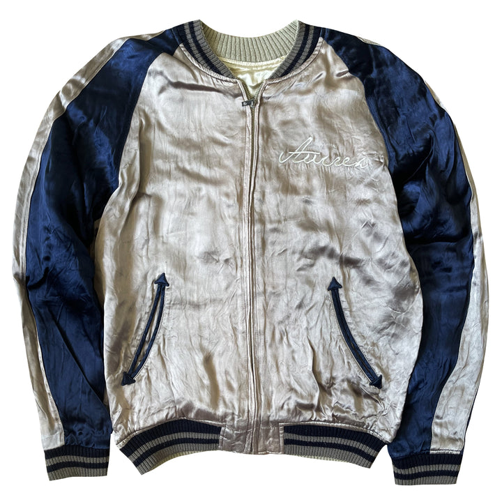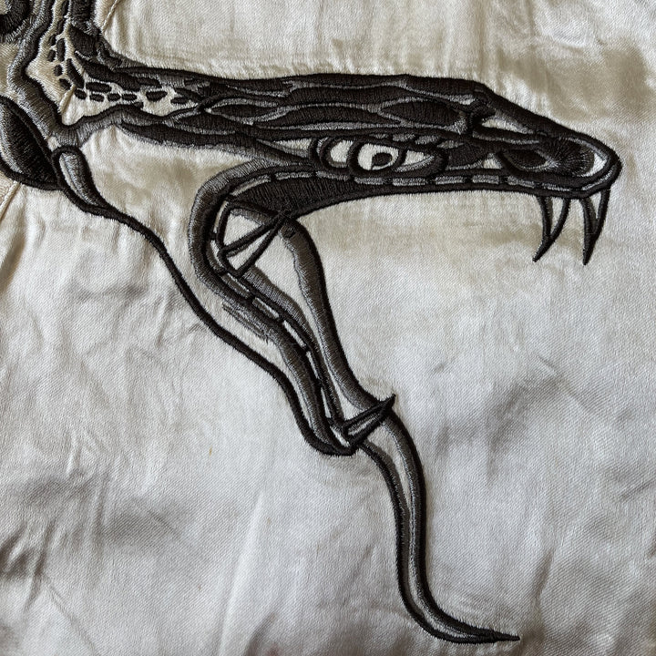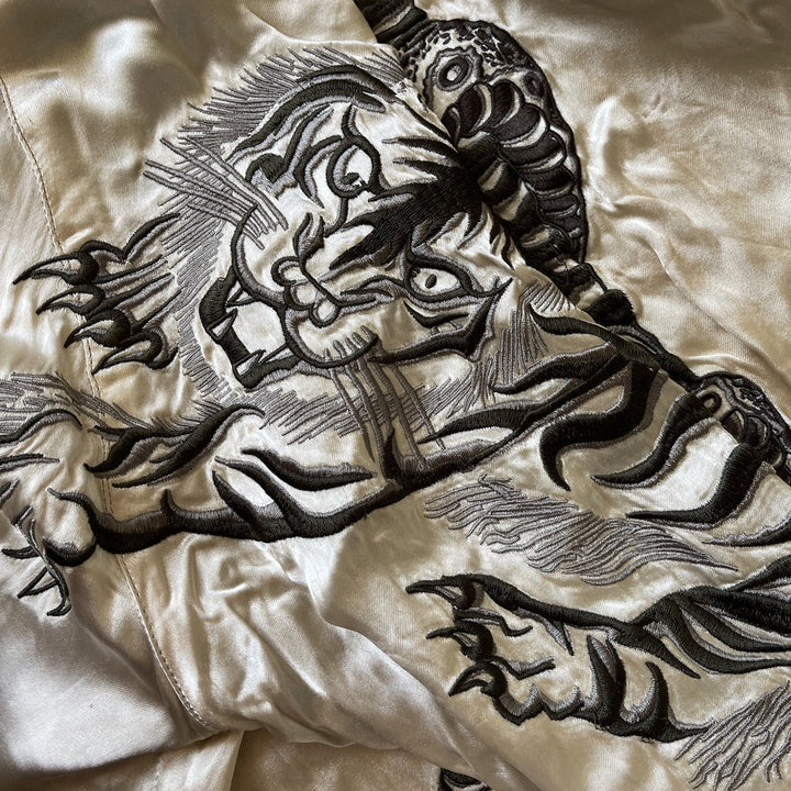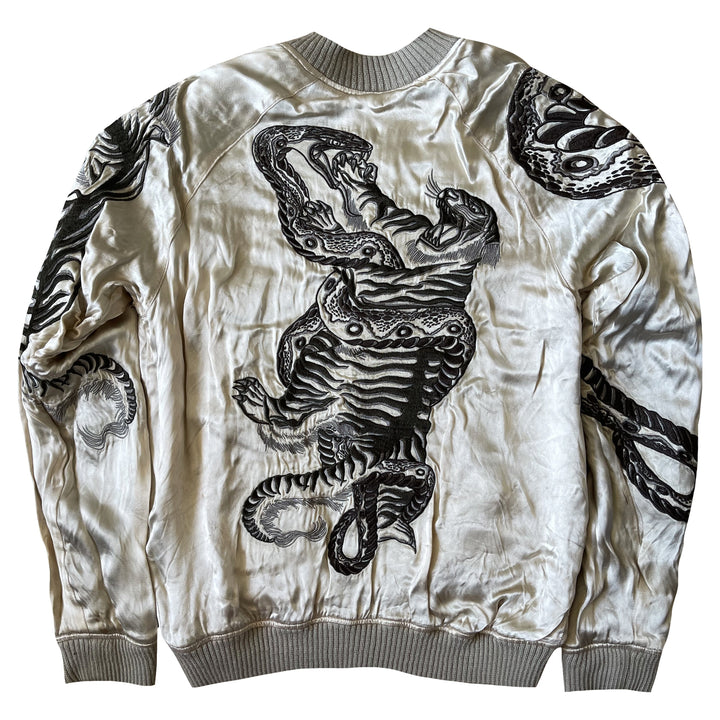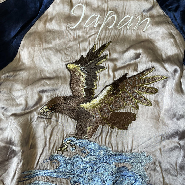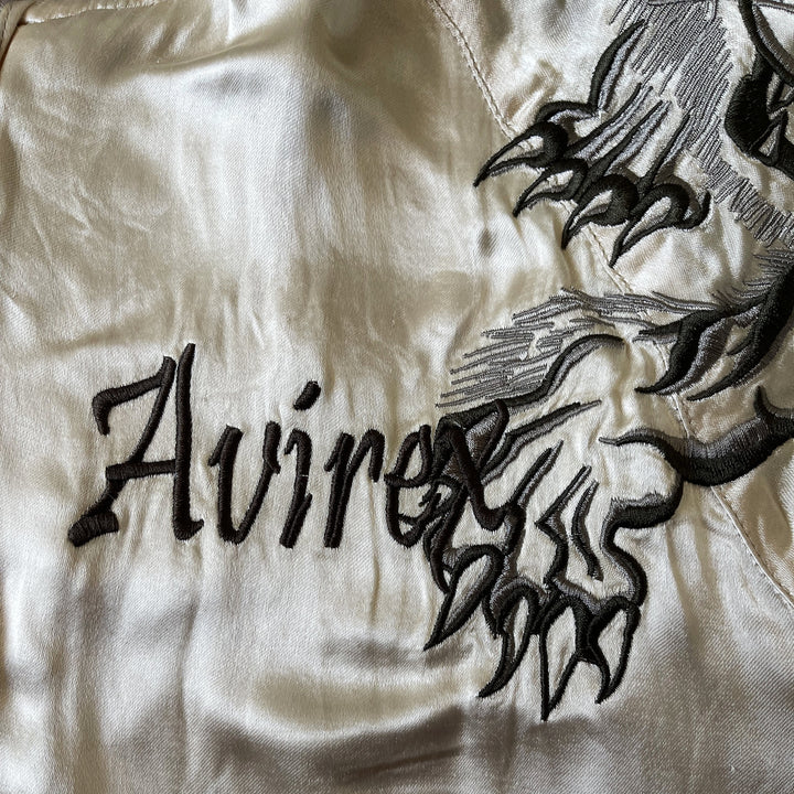 Avirex Reversible Sukajan Souvenir Jacket – Elevate your style with the Avirex Japanese Sukajan jacket, a reversible design showcasing two bold and intricate embroidered designs. One side features a striking snake and tiger tattoo, while the reverse boasts a powerful eagle and wave embroidery. The jacket shows light wear on one side as displayed, but no visible marks when worn, thanks to the fabric's natural sheen. A true collector's item, this jacket blends luxury, culture, and craftsmanship in a standout, versatile piece.