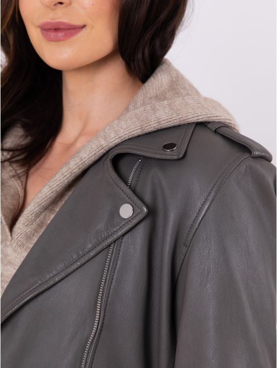 Leather jackets are usually made from cowhide, sheepskin, goatskin, or lambskin. Faux leather jackets use PU or vegan leather.