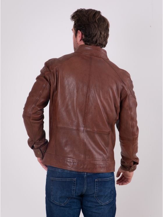 No, a leather jacket should not be machine washed. Instead, wipe with a damp cloth and use leather cleaners for stains.