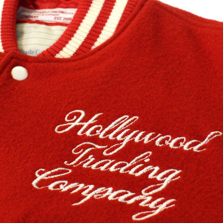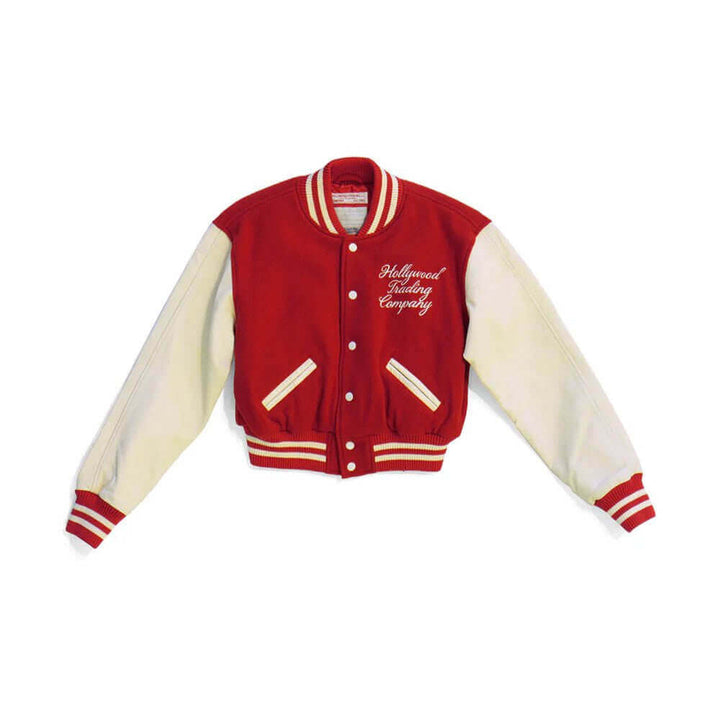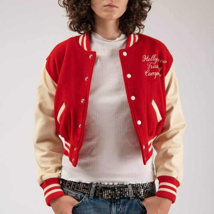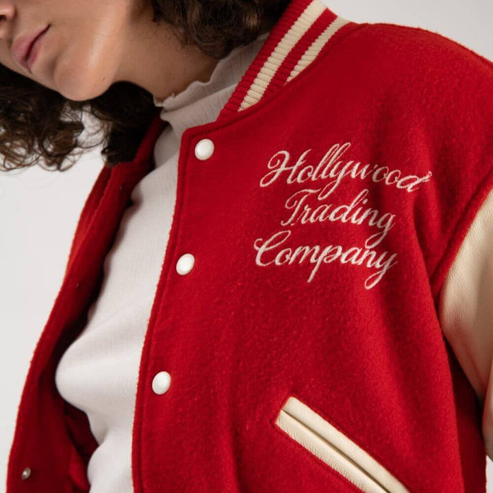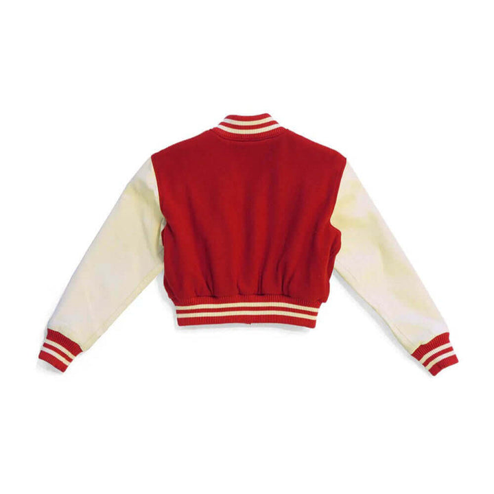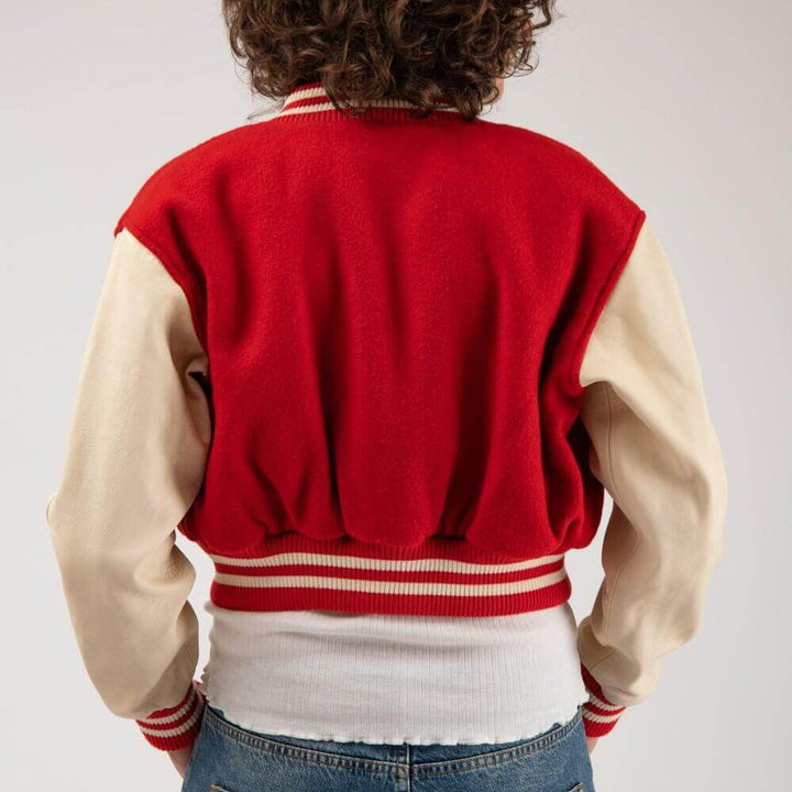 Varsity wool & leather bomber jacket. Front button closure, ribbed collar, cuffs and hem. Embroidered details. Two side pockets. Main body composition: 70% Wool, 30% Acrylic; sleeves: 100% Leather
