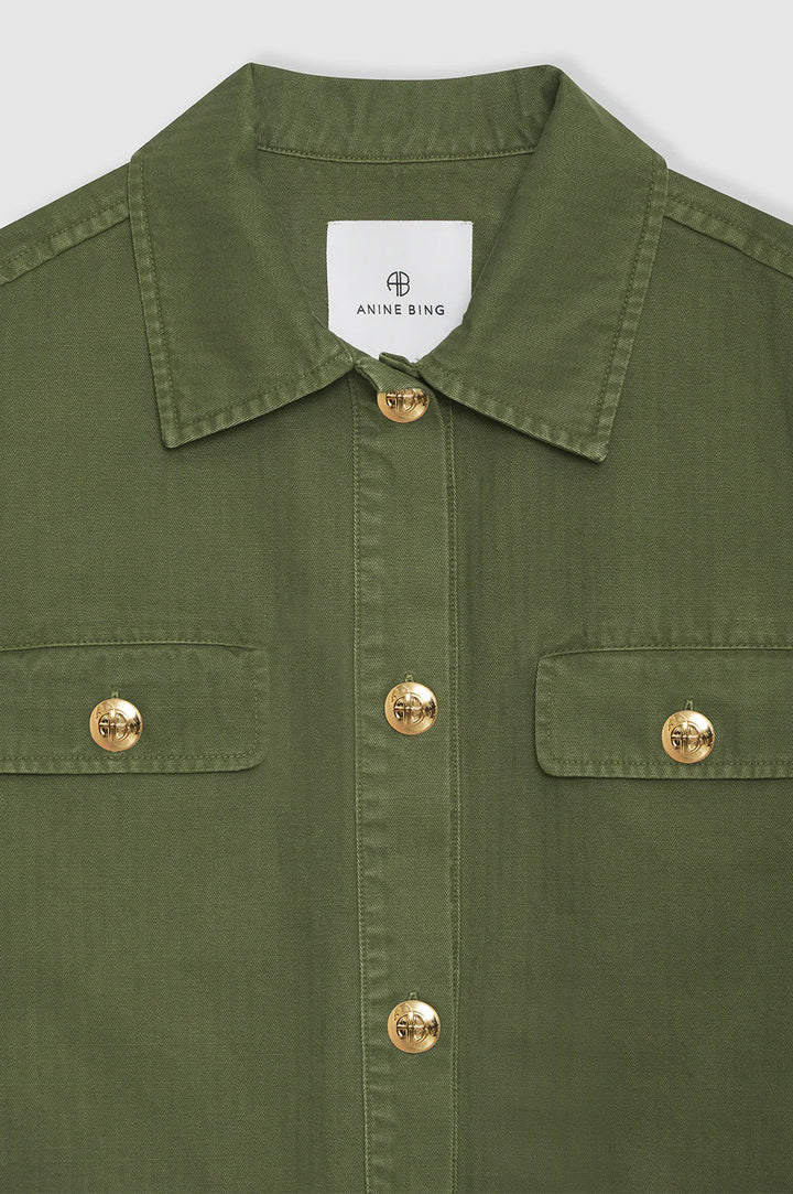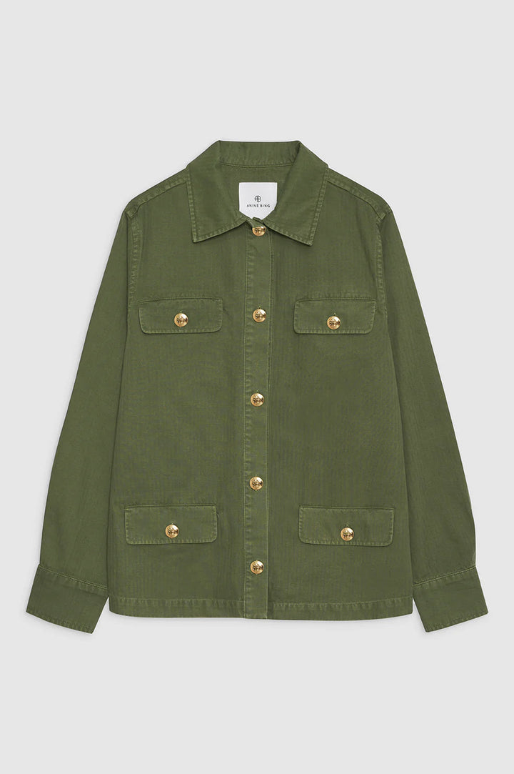 The Corey Jacket is made from midweight 100% cotton with a structured weave in a fine herringbone pattern. Its practical construction features full-length sleeves secured by single-button detailing at each cuff and four functional flap pockets. Accented with gold buttons with ANINE BING engraving down the center-front placket.