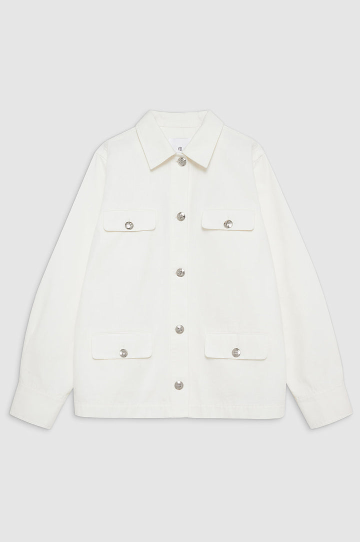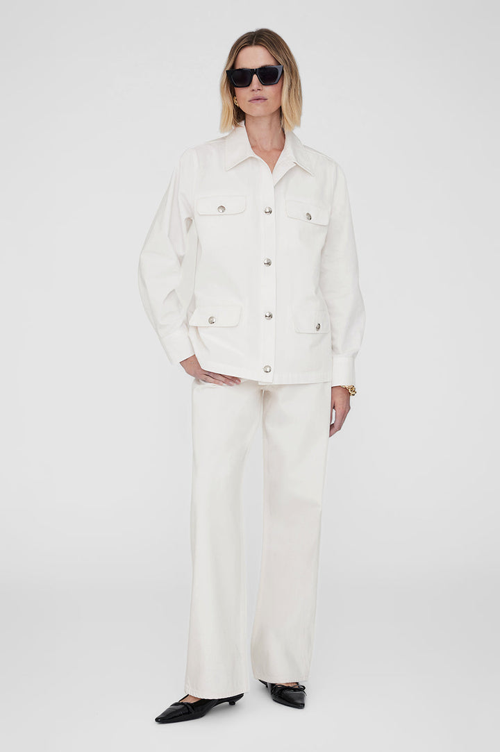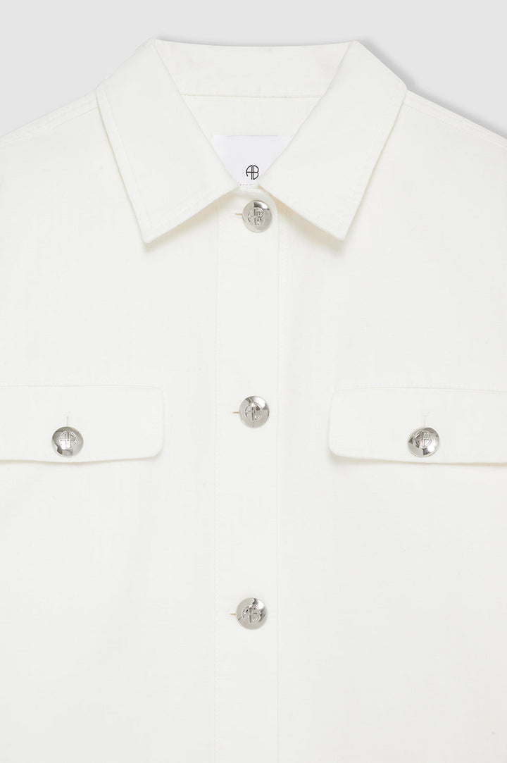 The Corey Jacket is made from midweight cotton canvas in ecru white. Its practical construction features full-length sleeves secured by single-button detailing at each cuff and four functional flap pockets. Accented with gold buttons with ANINE BING engraving down the center-front placket.