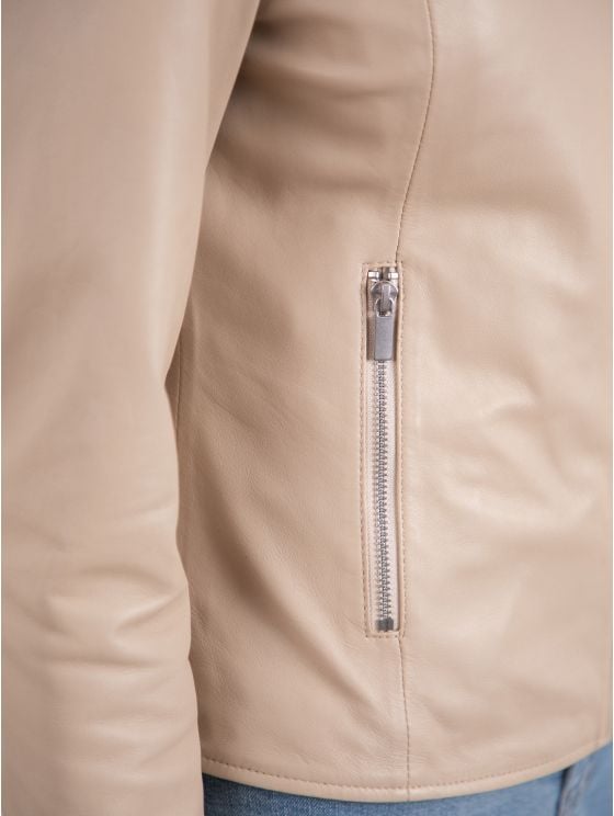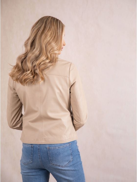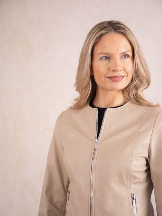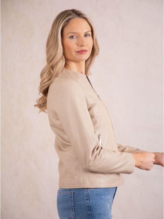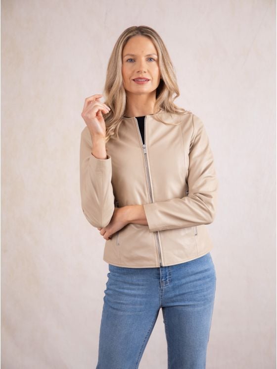 Introducing our Crosby leather jacket in light parchment, in a chic collarless design. Crafted from sumptuously soft nappa leather with tapered side panels to accentuate your figure, this jacket has a simple zip front and zip pockets in a muted silver colour. It's complete with flattering panel stitch detailing to ensure you look sophisticated whatever the occasion. Perfect with jeans and a jumper as well as a nice dress, it'll go with everything.