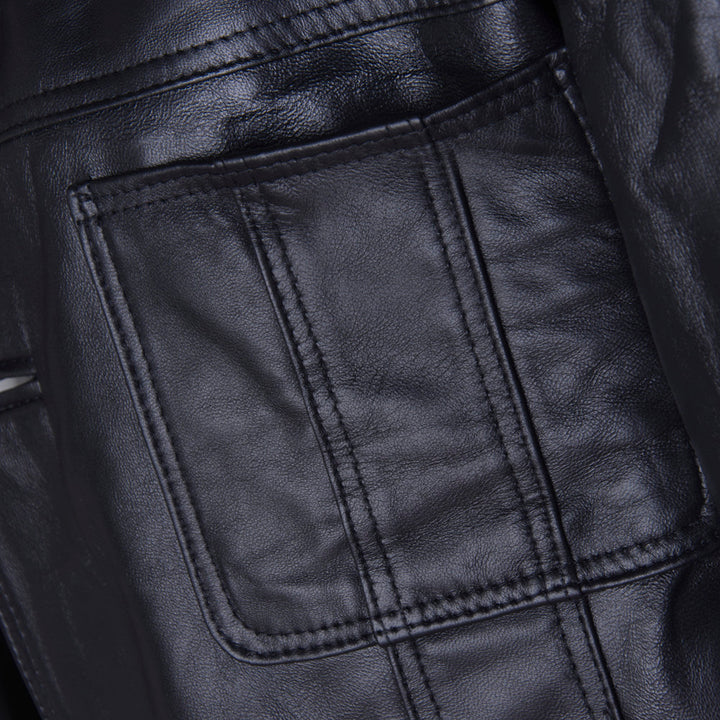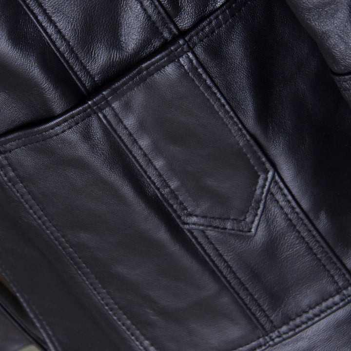 Leather jackets are usually made from cowhide, sheepskin, goatskin, or lambskin. Faux leather jackets use PU or vegan leather.