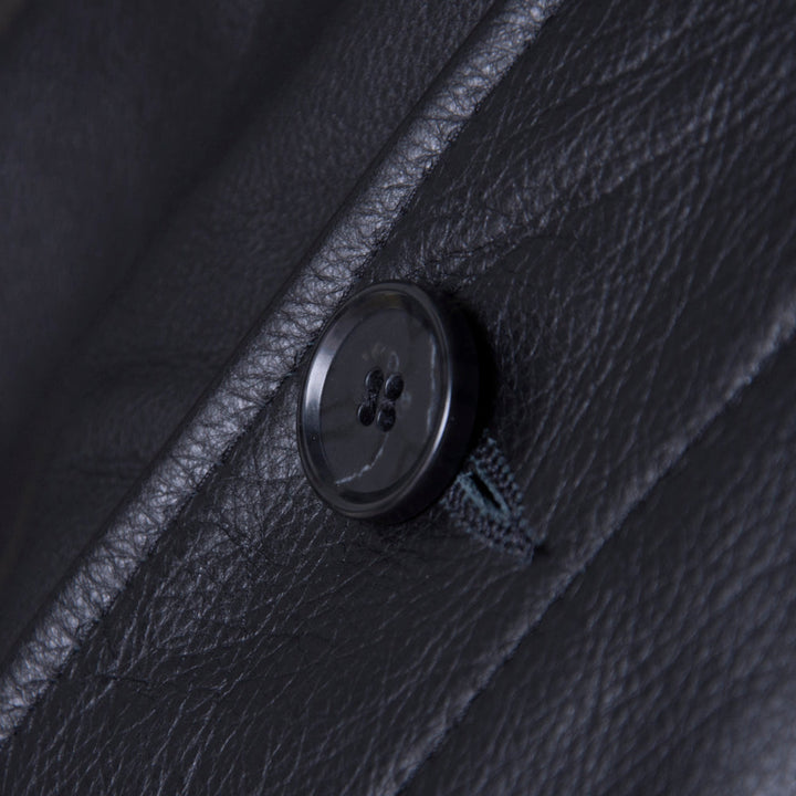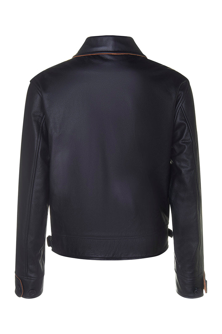 The jacket is made out of a grainy black hide, with suede tan features on the underside of the collar and the inside of the cuff.