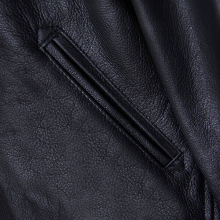 Leather jackets are usually made from cowhide, sheepskin, goatskin, or lambskin. Faux leather jackets use PU or vegan leather.