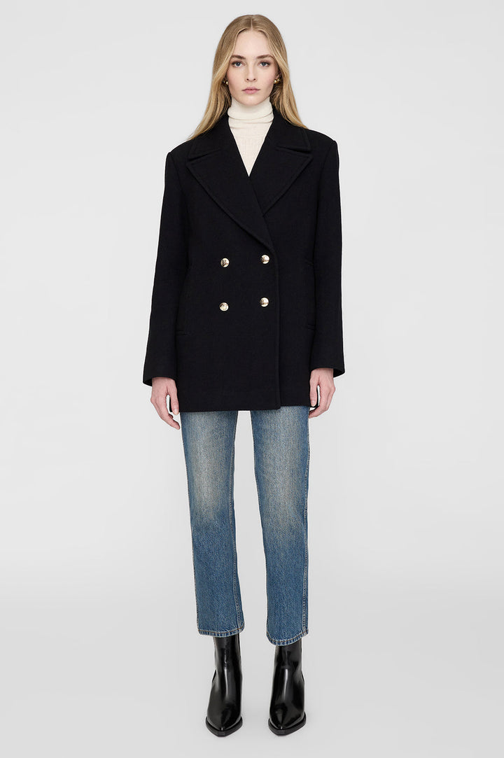 A traditional peacoat made from a heavyweight wool blend with a herringbone texture and soft hand. The Glenn Peacoat is fully lined and features a double-breasted closure with four gold ANINE BING branded buttons and vertical front welt pockets.