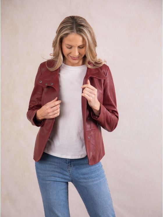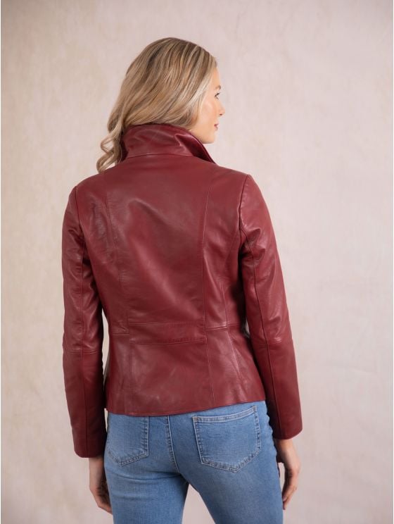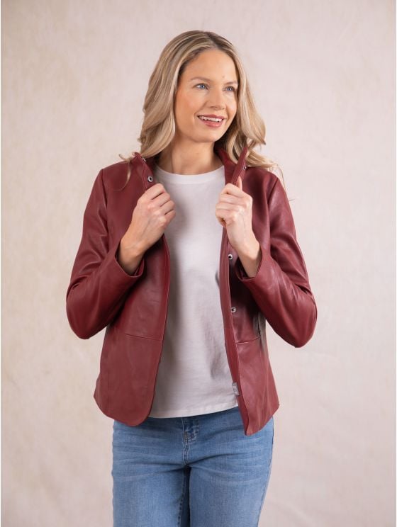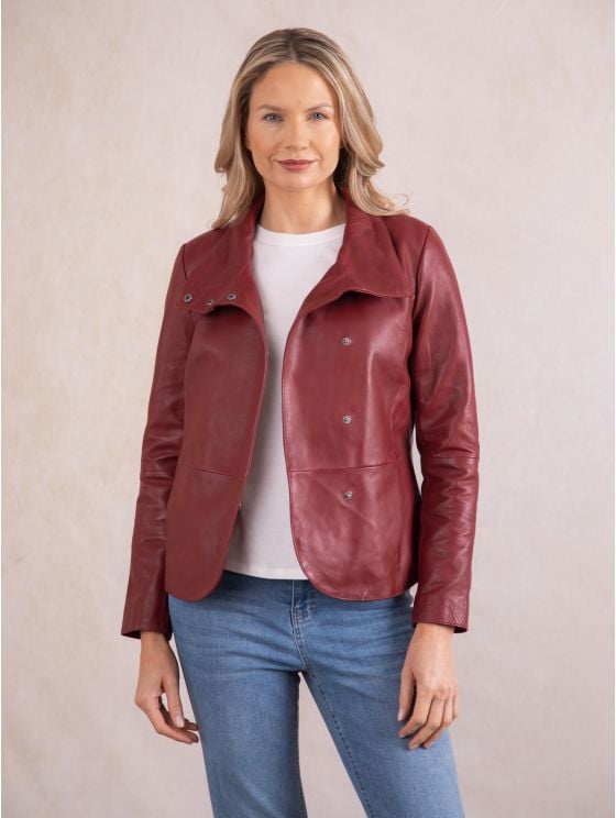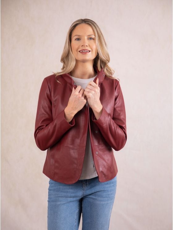 Understated elegance defines the Karen leather jacket. Crafted from buttery-soft nappa leather, its streamlined silhouette is enhanced by a sophisticated funnel neck collar and a clean press-stud front fastening. A curved hem adds a subtle, feminine touch, while two side slip pockets blend practicality with effortless style. Designed for a refined yet relaxed fit, Karen is the perfect go-to layer for effortless everyday dressing.