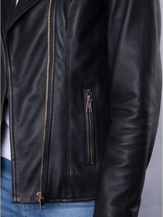 Leather jackets are usually made from cowhide, sheepskin, goatskin, or lambskin. Faux leather jackets use PU or vegan leather.