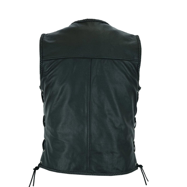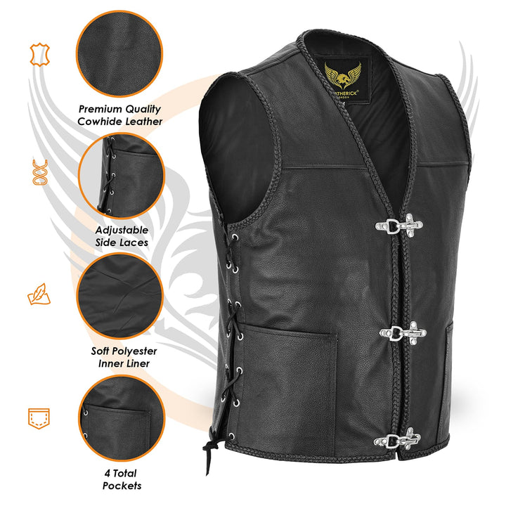 - Braided Look and Closure: This biker jacket has a V-Neck and 3 Traditional Biker Style Rust-resistant Chrome coated fish hook buckles to fasten the vest. It has a hand-plaited braid on the edges.