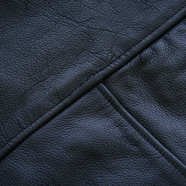 Leather jackets are usually made from cowhide, sheepskin, goatskin, or lambskin. Faux leather jackets use PU or vegan leather.