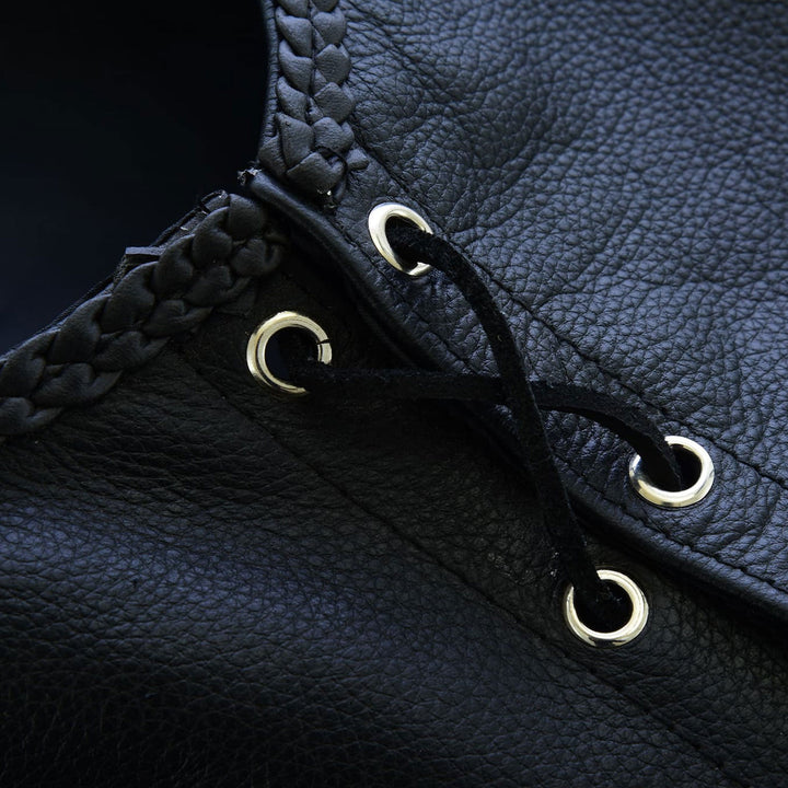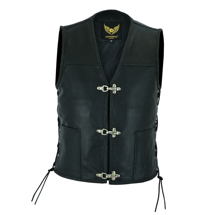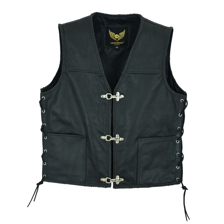 The Leatherick Black Fishhook Buckle Leather Vest With Side Laces is a distinctive and stylish vest designed for bikers and fashion enthusiasts. Made from high-quality black leather, this vest features unique fishhook-style buckles for a secure and eye-catching front closure. The vest is equipped with side laces, allowing for an adjustable fit and added comfort. It also includes a practical pocket for convenient storage. The combination of robust leather, intricate buckle design, and customizable side laces makes this vest a perfect blend of functionality and edgy style, ideal for those looking to make a statement on and off the road. Leatherick uses rust-resistant fish-style hooks to complement this outfit. These hooks are rust-proof and chrome-plated. Its Braided look is stylish in the sense of its elegance and class. Its traditional V-Shape front enables you to wear it comfortably over a hoodie or jacket.