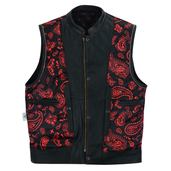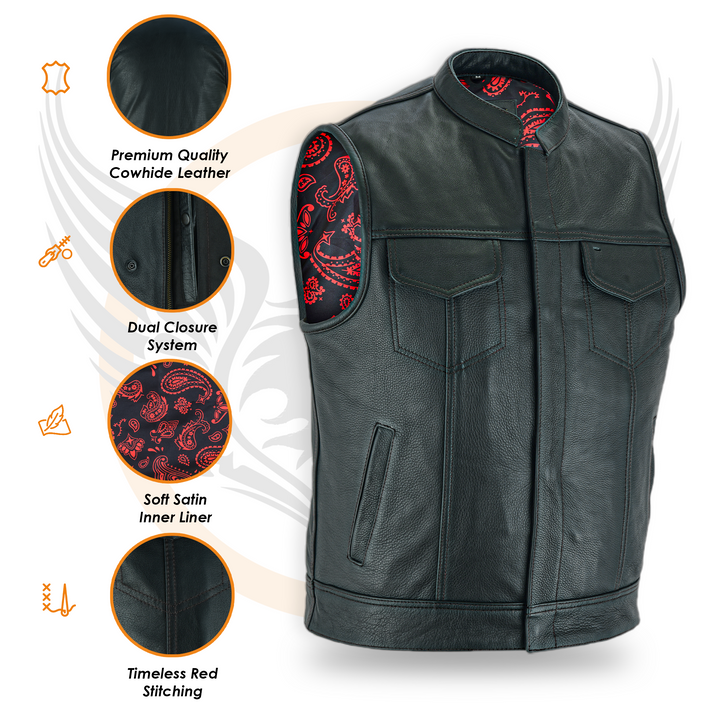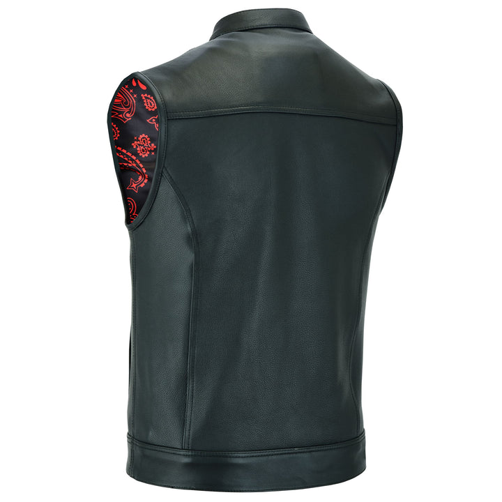 Leatherick Men’s Black Leather Biker vest with Paisley Liner