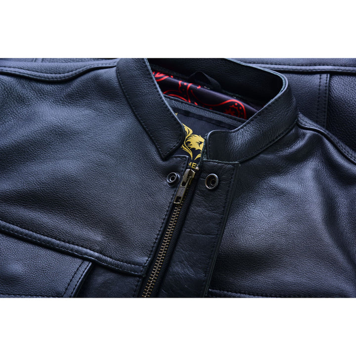 The Leatherick Men’s Black Leather Biker Vest With Paisley Liner is a sophisticated and durable piece designed for the discerning biker. Made from high-quality black leather, this vest features a sleek, streamlined design with a concealed zipper and snap-button front closure for a secure fit. The interior is lined with a vibrant red paisley pattern, adding a unique and stylish touch. The vest is equipped with practical storage options, including two chest flap pockets and two side hand pockets. Its combination of rugged construction and refined details makes it ideal for both motorcycle riding and casual wear, offering a perfect blend of functionality and fashion.