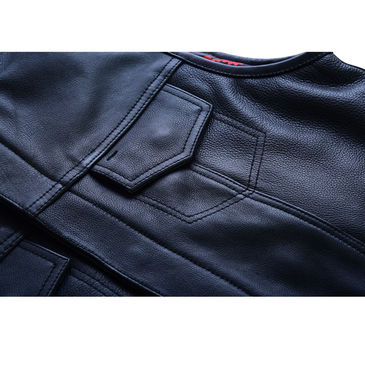 Furthermore, our black leather vest has two chest pockets, two flap hand-warmer pockets that are complementary and ideal to hold all your gadgets, and four inside pockets that will make you stand out. This premium black leather comfortable waistcoat is not only ideal apparel for a bike ride but will accompany you to any occasion you can think of.