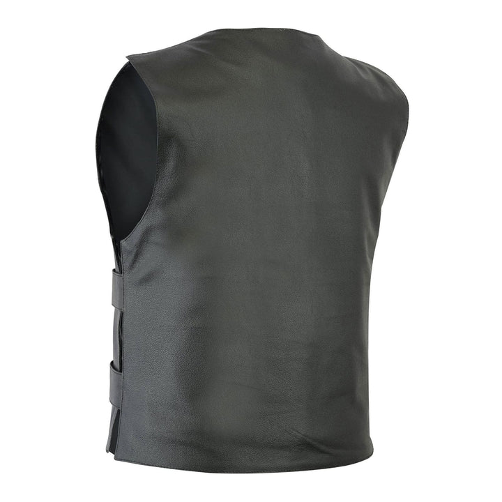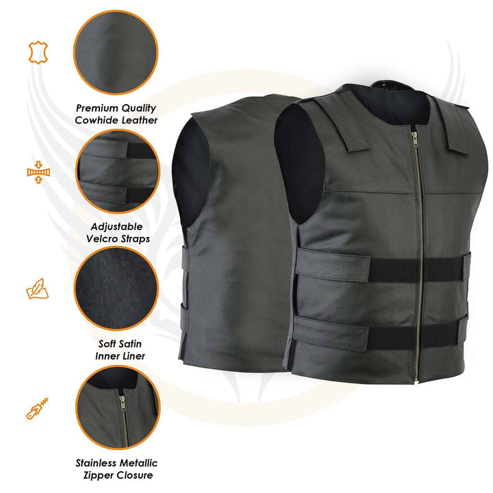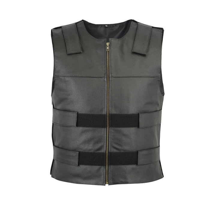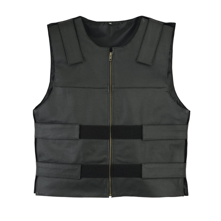 The Leatherick Men’s Bullet proof style Black Biker Leather Vest is designed for bikers who prioritize both safety and style. Made from high-quality leather, this vest features a robust construction with a tactical, bulletproof aesthetic. The front zipper closure ensures a secure fit, while the adjustable Velcro straps on the sides and shoulders provide a customizable fit for added comfort and flexibility. Its minimalist, sleek design is both functional and fashionable, making it an ideal choice for bikers seeking protection and style. The vest's durable materials and practical design make it perfect for long rides and everyday wear, offering a unique blend of safety and sophistication. The vest style is like Bullet Proof but doesn’t offer any bullet proof protection.