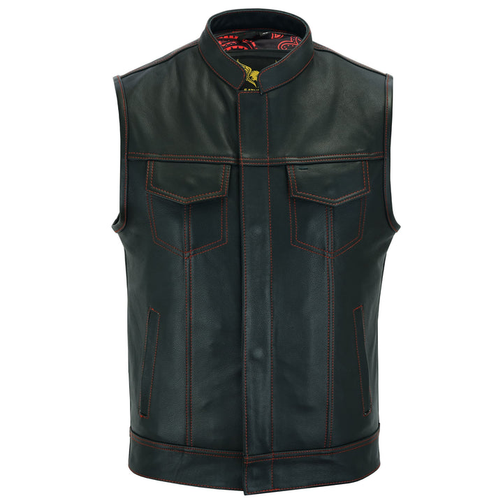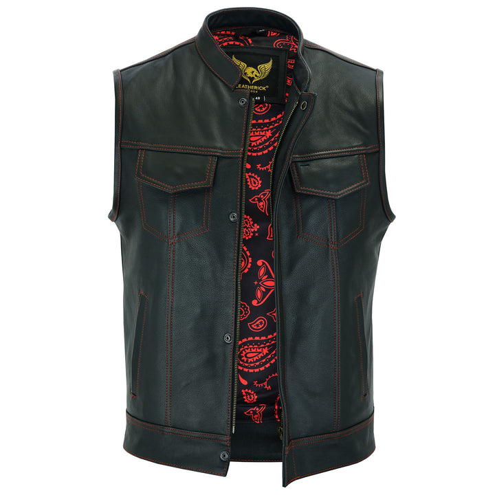 Leatherick Men’s Red Stitch Leather Biker Vest With Paisley Liner