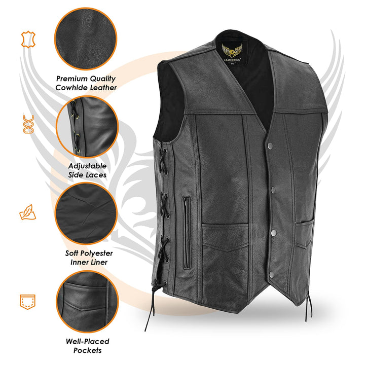 The Leatherick Men Side Laces Cow Hide Real Leather Biker Vest is crafted from genuine cowhide leather, offering exceptional durability and a timeless biker aesthetic. It features a snap-button front closure for easy wear and adjustable side laces to ensure a perfect fit. The vest is designed with ample storage options, including two front pockets and two side pockets, making it practical for everyday use. Combining sleek design with high-quality materials, this vest is perfect for bikers who value both style and functionality.