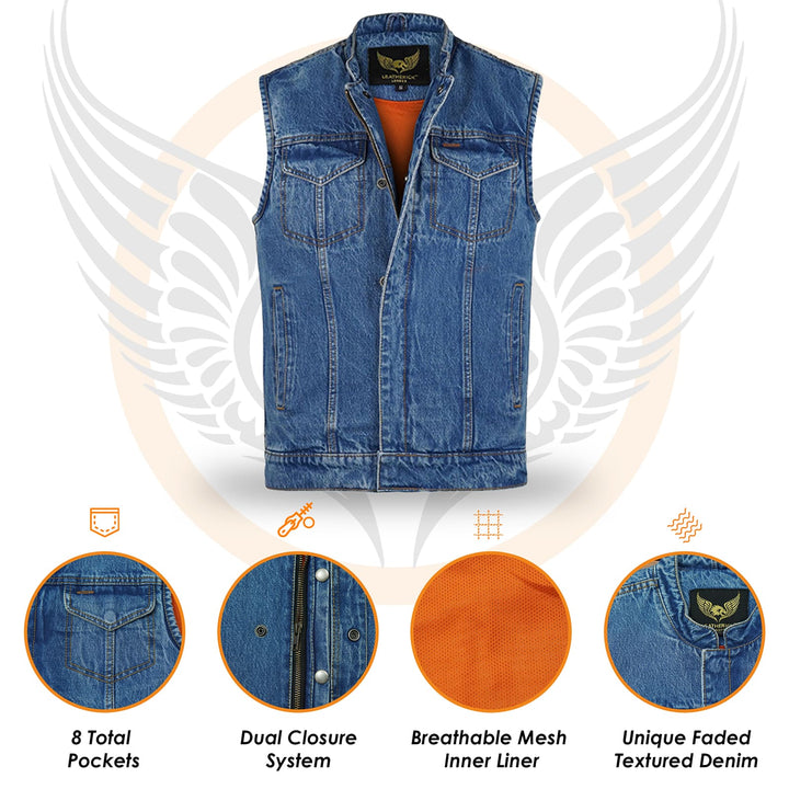 The dual Closure functionality enables you to fasten this vest. The vest snaps only (enables air to pass through) or Zip Only (For less Air to Pass-through) or use both (No Air will Pass-through), making it the best men’s denim vest for both Hot and Cold seasons.
