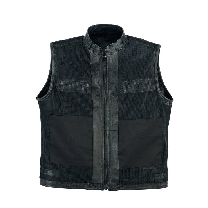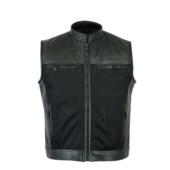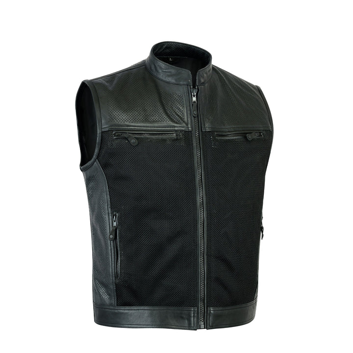 The Leatherick Mens Perforated Biker Leather Vest is designed for optimal comfort and style, especially in warmer conditions. Made from high-quality leather, this vest features perforated panels that enhance breathability and airflow, keeping the wearer cool during rides. It has a front zipper closure for a secure fit and two zippered chest pockets, along with two zippered side pockets, providing ample storage for essentials. The sleek, modern design is complemented by a collarless neckline, adding to its contemporary appeal. This vest combines functionality with a stylish look, making it an excellent choice for bikers seeking both performance and fashion. This perforated style bikers leather have perforated panels on the chest pockets and leather piping along with the finishing, give it a comfortable-looking style.