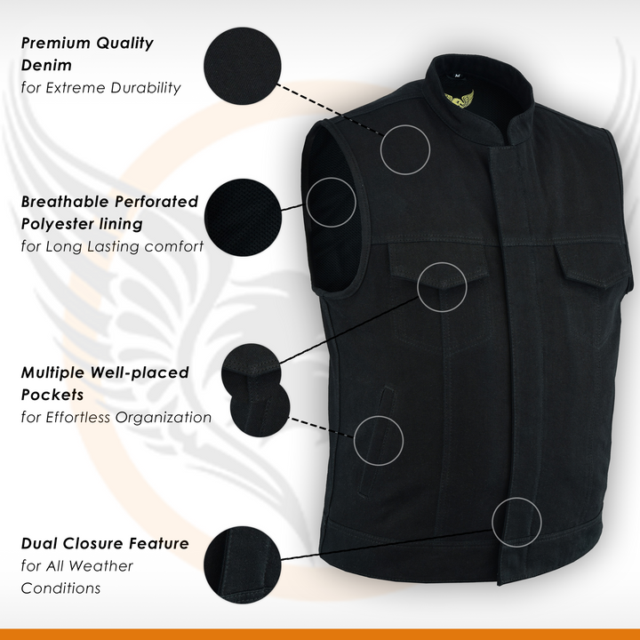 - Breathable Denim Lining: This vest is lined with denim and Perforated Polyester Fabric to make it the best companion for long sunny rides.