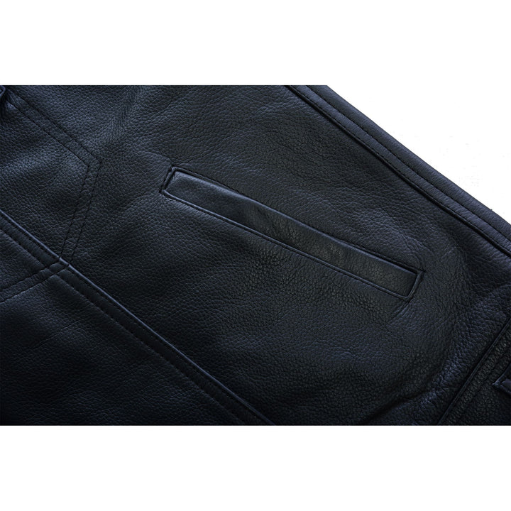 Ride in style with a Leatherick genuine leather motorcycle vest. Fall in love with this beautiful leather cut for any of your biker events or other outdoor activities. This premium black leather vest is designed for those who value both style and functionality. It features a sleek, sleeveless design for a comfortable and tailored fit. The vest is equipped with multiple pockets, including two front flap pockets and two side pockets, providing ample storage. The front closure combines a zipper with snap buttons for added security and ease of use. The high collar adds a touch of sophistication, while the durable leather construction ensures longevity. Perfect for motorcycle enthusiasts or anyone looking to add a rugged yet stylish piece to their wardrobe. We are confident that our range of leather and denim biker vests will meet and exceed your expectations.
