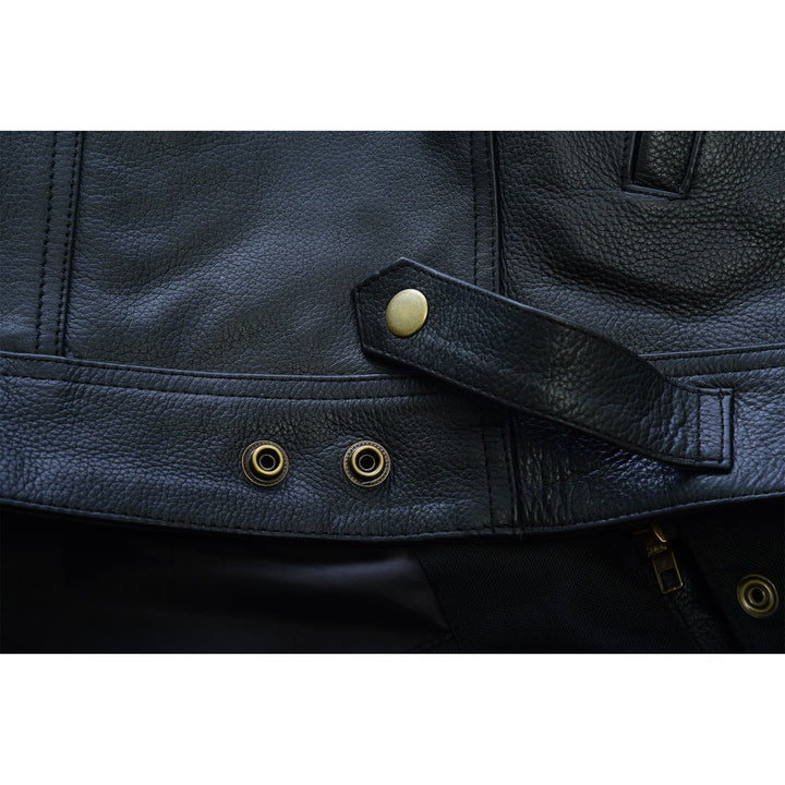 - Open Button Feature: This leather vest is designed with an open button feature. It has 4 front brass snaps to fasten the vest. It also has side waistbands to adjust the size accordingly.