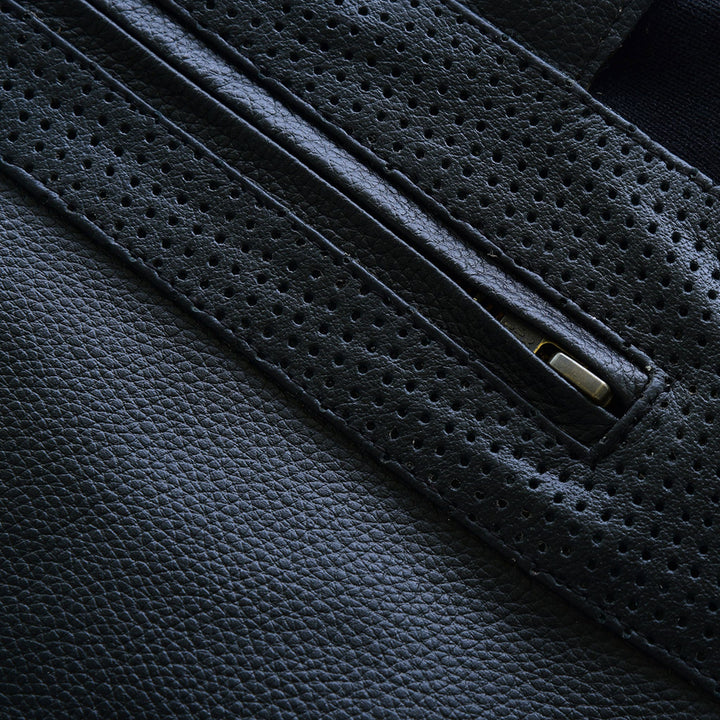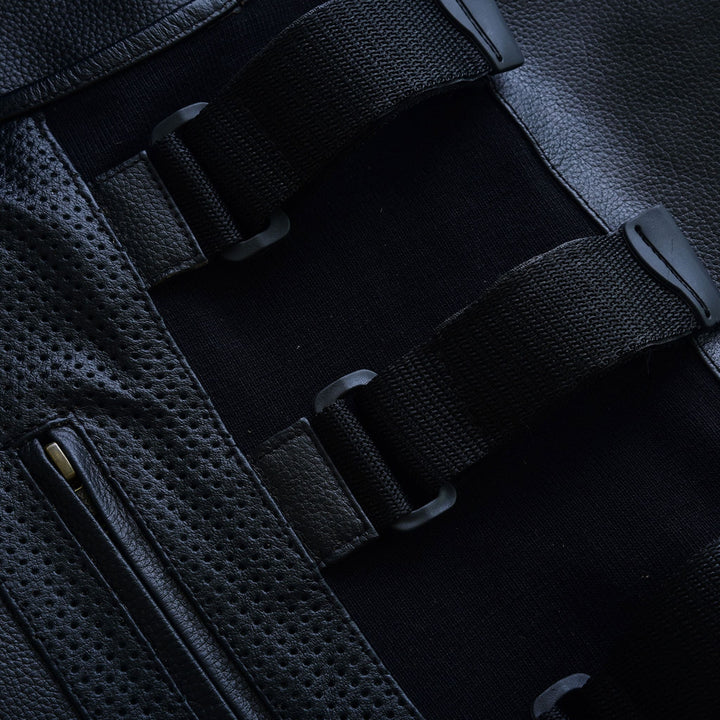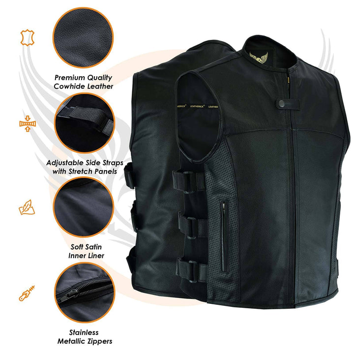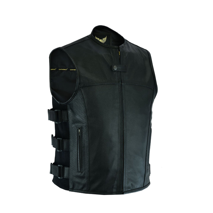 The Leatherick SWAT Leather Vest With Perforated Pocket Panels is crafted for bikers who value both style and practicality. Made from premium leather, this vest incorporates perforated pocket panels to boost breathability and airflow, ensuring maximum comfort during rides. It features a secure front zipper closure complemented by an additional snap-button at the collar. The design includes multiple pockets, including two zippered chest pockets and two side pockets, offering ample space for your essentials. With adjustable side straps and buckle closures, the vest allows for a tailored and comfortable fit. Blending robust durability with a sleek, modern aesthetic, this vest is ideal for bikers looking for a practical yet stylish addition to their gear.