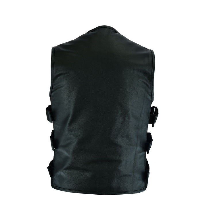Leatherick Men’s Tactical Style Leather Swat Motorcycle waistcoat with Gun Pockets is made up from Heavy Duty Cow Milled Leather (Durable, Top Grain 1.1-1.2 mm) with Adjustable Side Straps for perfect body fit. The vest is designed with a large back panel so you can stitch your logos and patches on it easily.