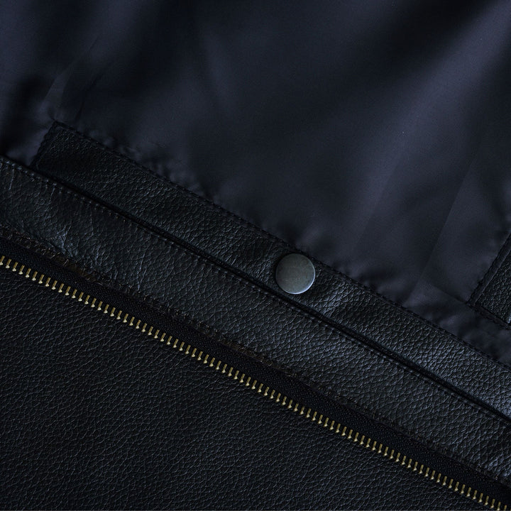 Leather jackets are usually made from cowhide, sheepskin, goatskin, or lambskin. Faux leather jackets use PU or vegan leather.