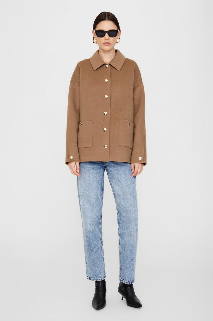 The Luca Jacket is made from our signature double-faced wool-cashmere fabrication in camel. This luxurious, everyday layer is unlined and features two patch pockets at the hips, dropped armholes, and side slits for effortless layering. Gold buttons with ANINE BING engraving decorate the center-front placket for an elevated look.