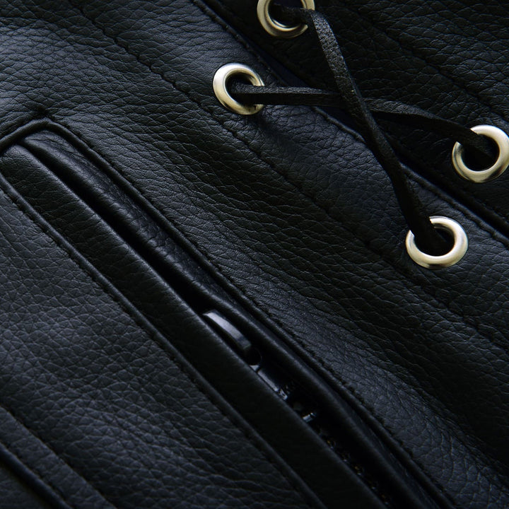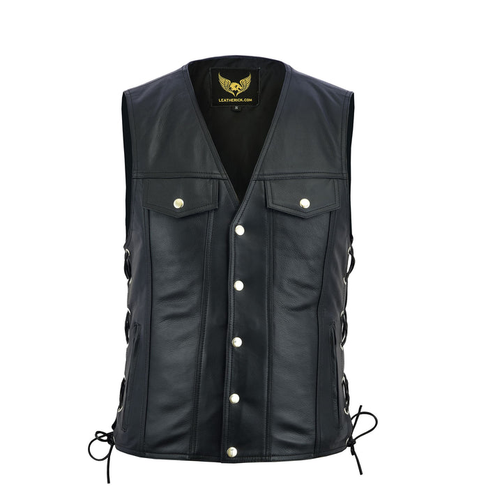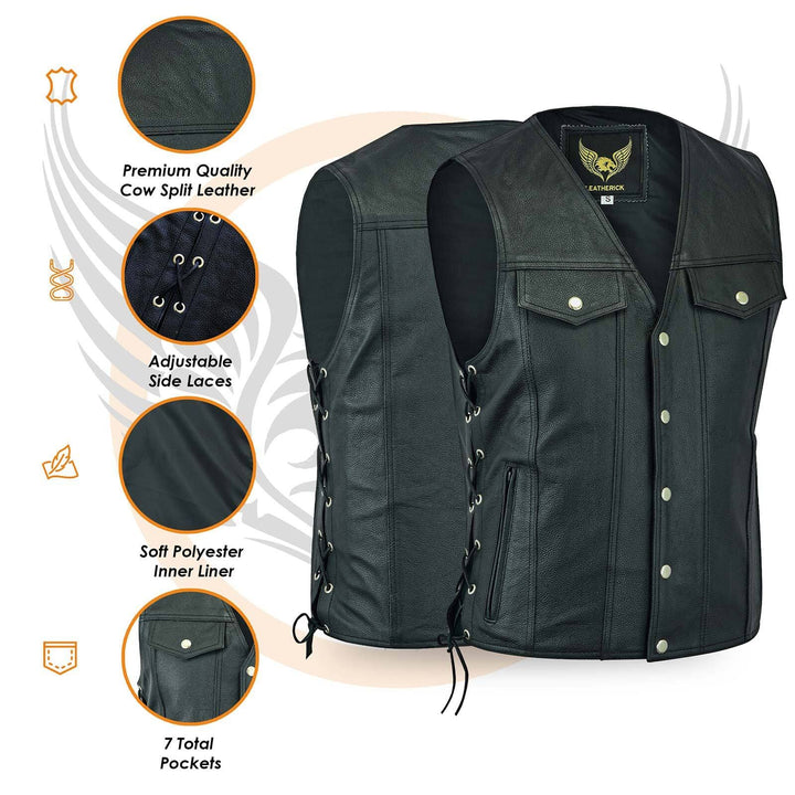 - Side Adjustments and Closure: This Leather cut has a V-Neck and is stitched with 4 rust-resistant snaps to fasten the waistcoat. Side laces help you to adjust the size of the vest as per your body fit.