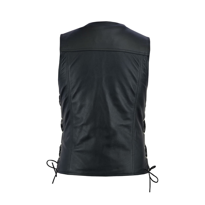 Leatherick Black Denim Style Leather Waistcoat for Bikers Premium Quality V-Neck Men Vest with Side Laces made from Heavy Duty Cow Milled Leather (Durable, Top Grain 1.1mm) with Adjustable Side Straps for perfect body fit. The vest designed with a large back panel so you can stitch your logos and patches on it easily.