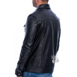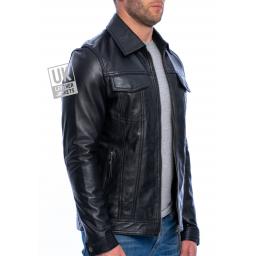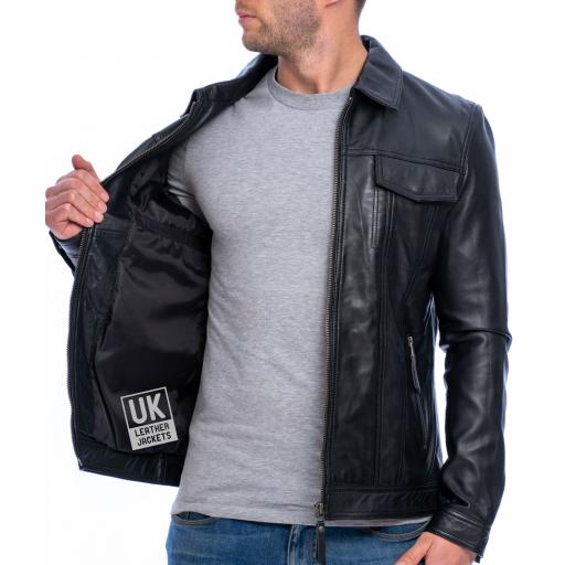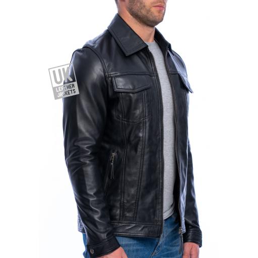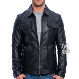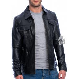A classic retro style mens black leather jacket or men with fold down shirt collar, patch pockets and zip pockets. Crafted in high grade soft leather. Free UK delivery and reduced price.