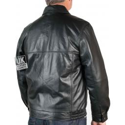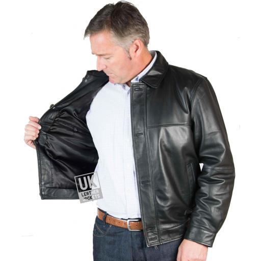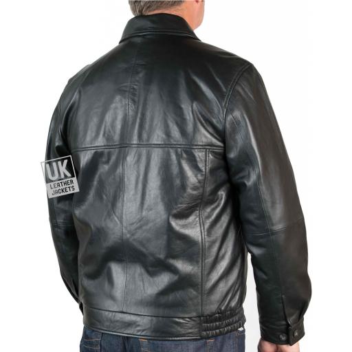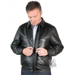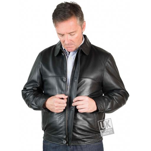 Classic blouson style black leather jacket, fold down collar, zip and button front fastening. Crafted in superior quality soft nappa leather in sizes S to 6XL.