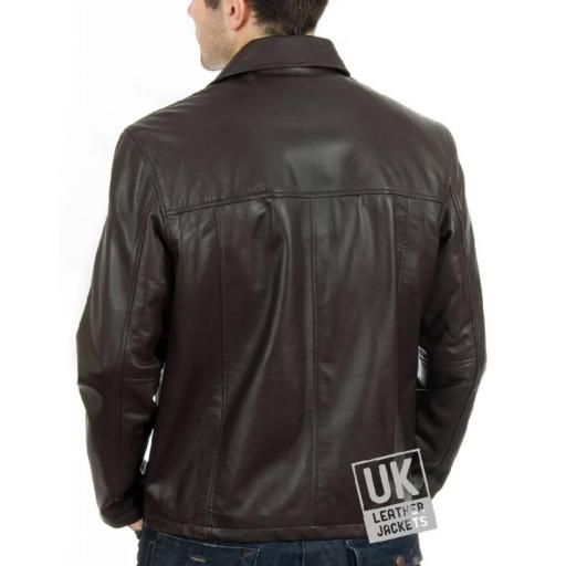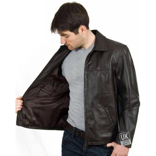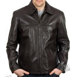 A classic mens brown leather jacket with a centre zip front fastening, fold down collar. Crafted in superior quality sheep nappa leather for all day comfort wear. On sale in sizes XS to 6XL.