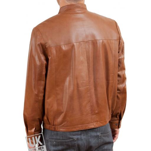 A classic blouson style mens tan leather jacket with short stand-up collar, crafted in high grade soft sheep nappa leather. View range of styles in sizes XS to XS at reduced prices.