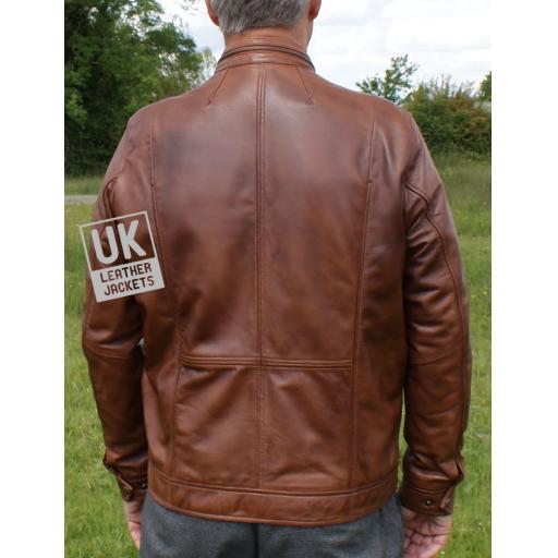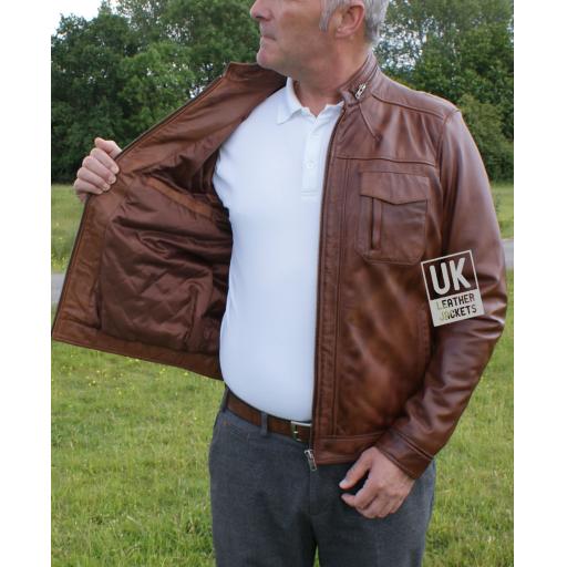 Crafted for all day comfort in superior soft nappa leather, this mens tan leather jacket features a centre zip closure, short collar, 2 waist pockets and 2 patch chest pockets. Free UK delivery.