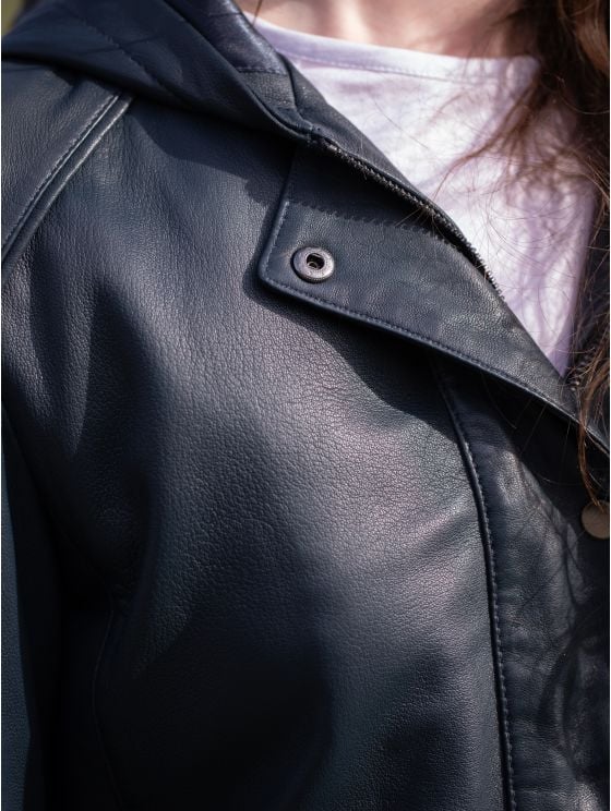 Leather jackets are usually made from cowhide, sheepskin, goatskin, or lambskin. Faux leather jackets use PU or vegan leather.