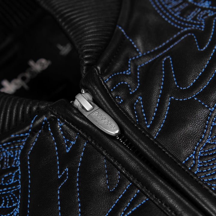 Leather jackets are usually made from cowhide, sheepskin, goatskin, or lambskin. Faux leather jackets use PU or vegan leather.