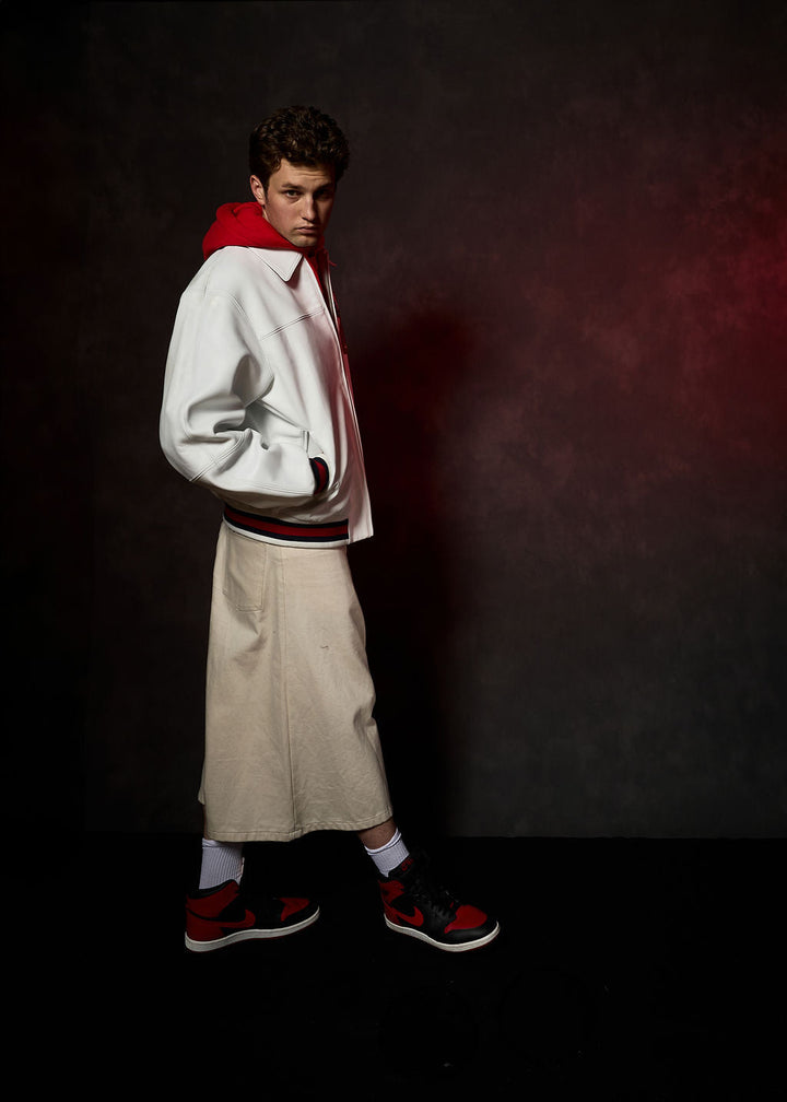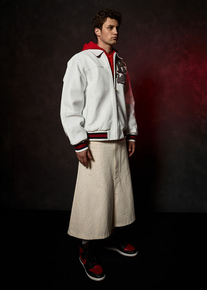 Leather jackets are usually made from cowhide, sheepskin, goatskin, or lambskin. Faux leather jackets use PU or vegan leather.
