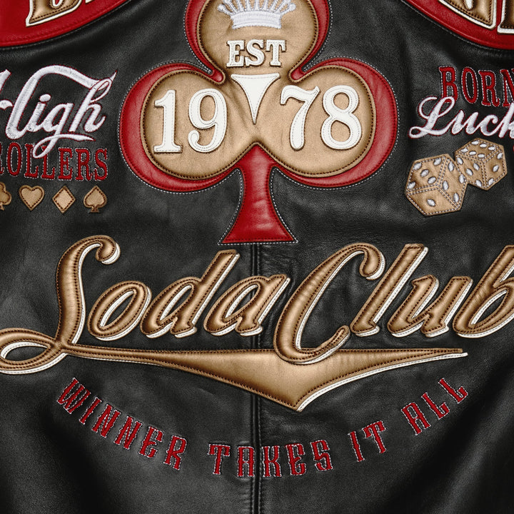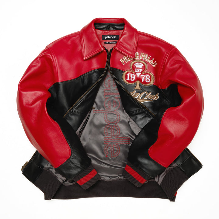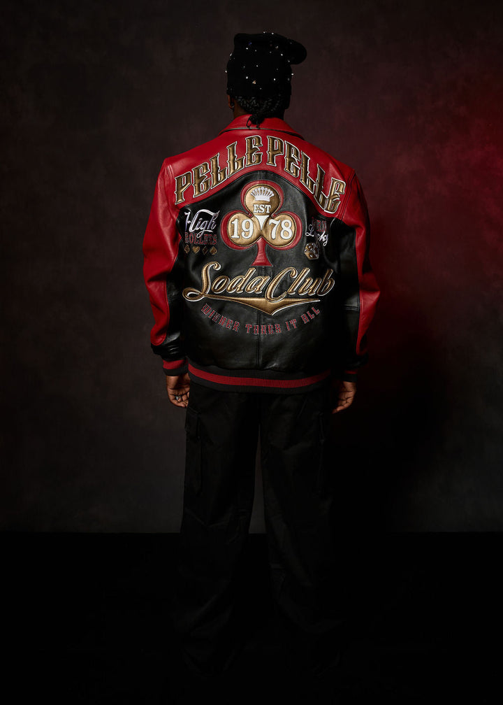 raised neoprene backed leather pelle pelle soda club edition artwork athe the wearer's left chest