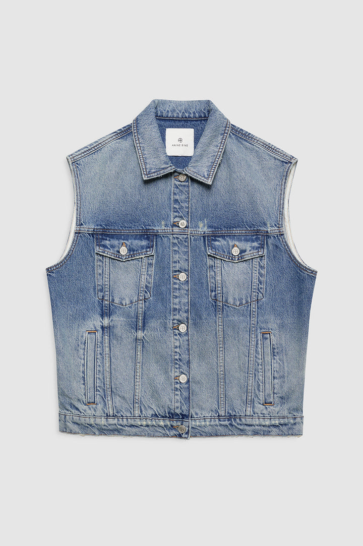 The Rory Vest is an everyday denim staple constructed from midweight 100% regenerative cotton denim without stretch in a vintage blue wash.