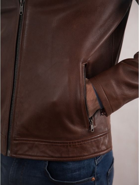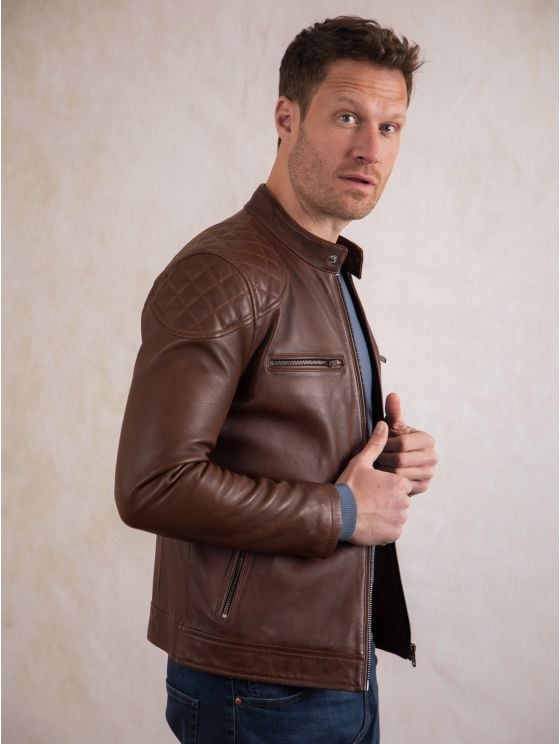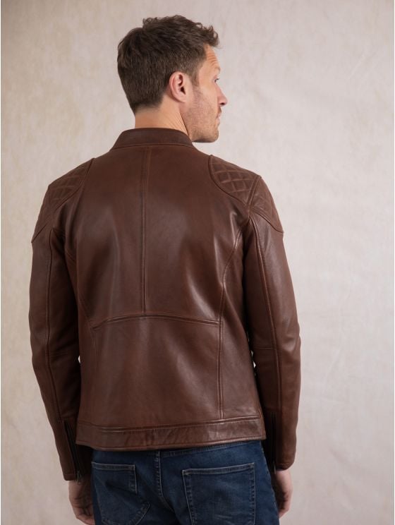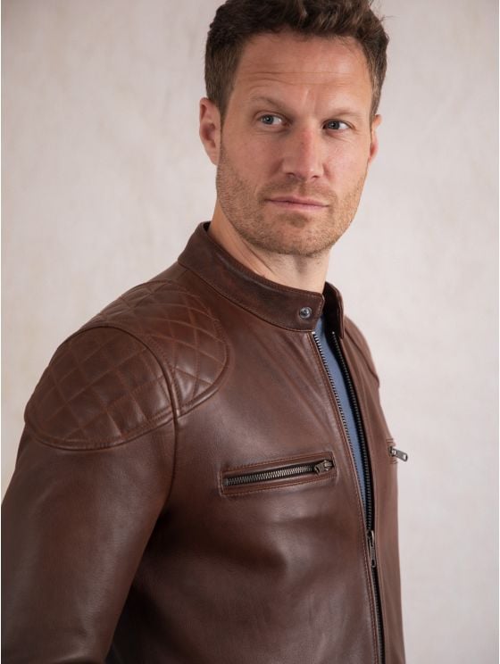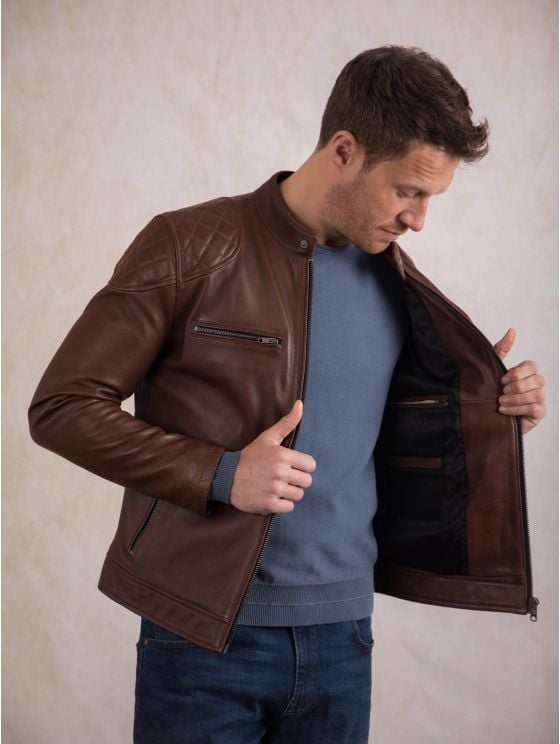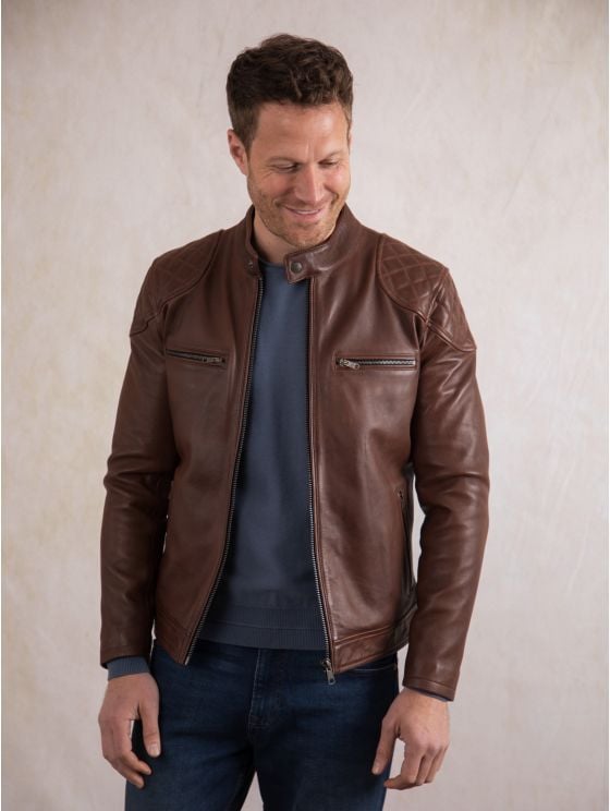 Achieve effortless casual style with the Stonecroft leather jacket. Crafted from the finest quality aniline leather in sophisticated dark tan, this jacket is designed to develop a natural patina over time, making it more unique to you to more you wear it.