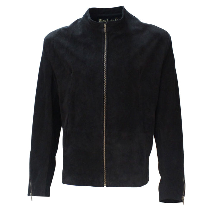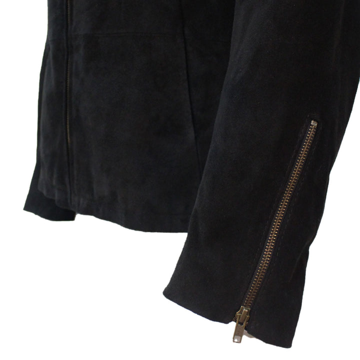 The item itself is made of soft black suede with gun metal zip on the front. It has two front pockets which are cut into the front dart seams (in the film they are handstitched at the top, but our jacket is NOT).