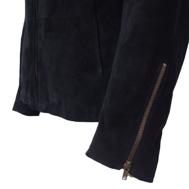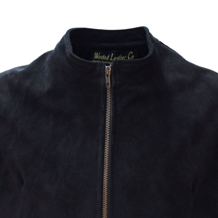 The item itself is made of soft Navy suede with gun metal zip on the front. It has two front pockets which are cut into the front dart seams (in the film they are handstitched at the top but our jacket is NOT).