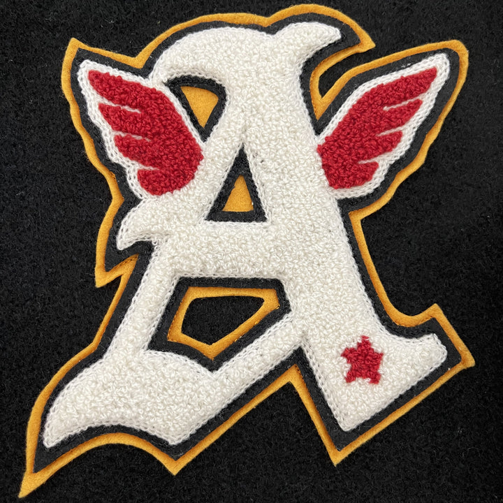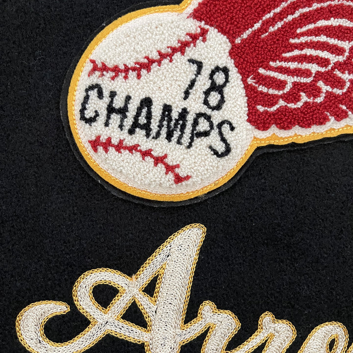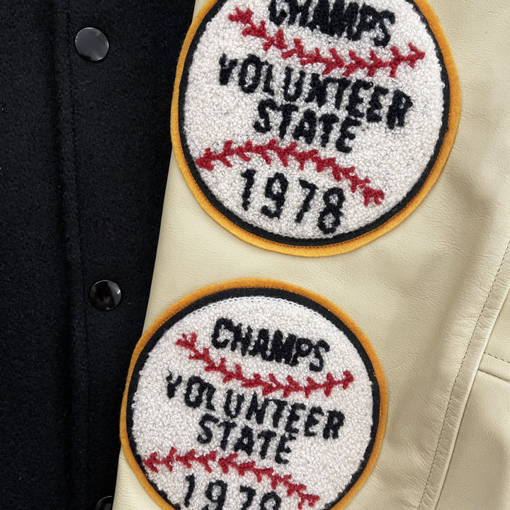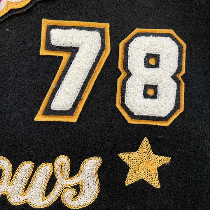 Chenille patches and detailed embroidery.